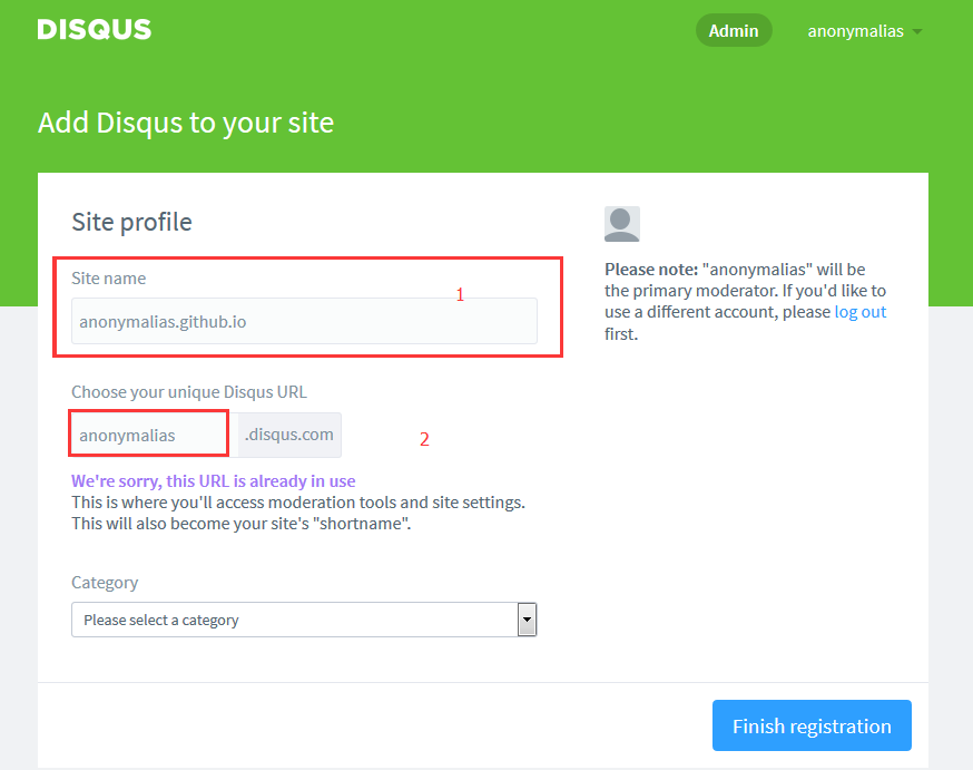 接入disqus,首先到官网https://disqus.com创建个人账户,然后为个人站点添加disqus功能,站点注册界面如下:
