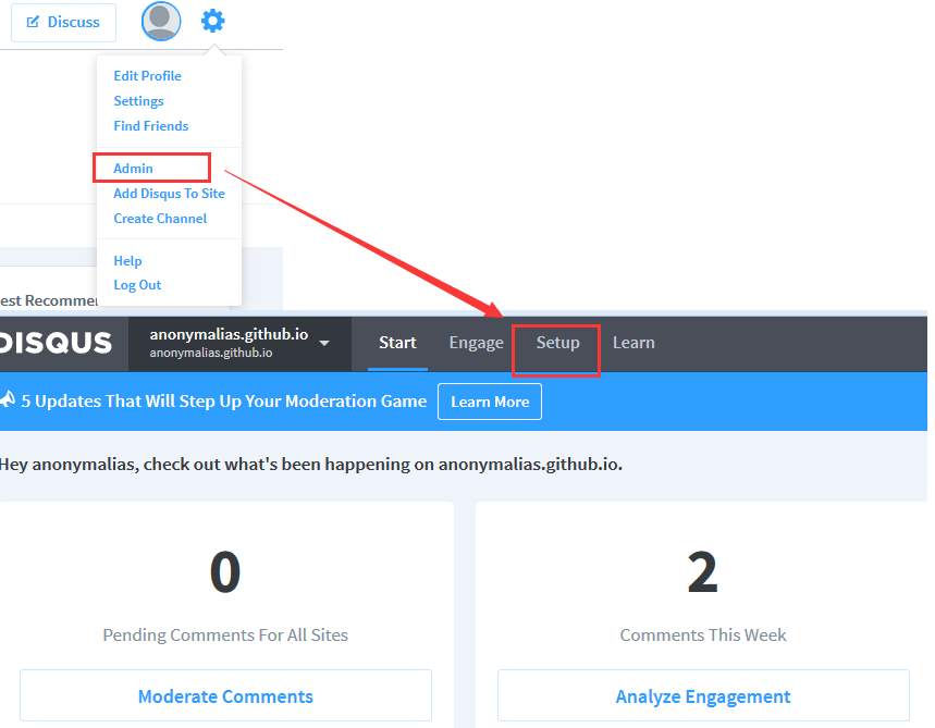 图中1表示要接入的站点的域名,2标识和1中站点名一一对应的disqus url, 2中输入的名字是一个shortname,这个shortname在主站的配置文件中要使用。注册完成后。进行下面配置:依次点击disqus主站上头像设置里的admin->setup->Basic: