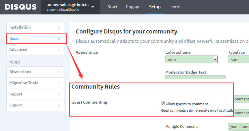 进入管理页面后,在Basic页签中下滑找到guest commenting选项进行勾选,允许guest进行评论。