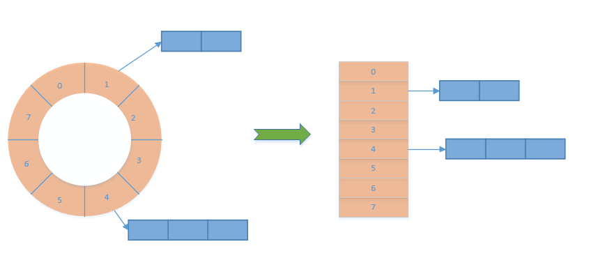 一级时间轮如下图所示:一个轮子(数组实现),轮子的每个槽(spoke)后面会挂一个timer列表,表示当命中该spoke时,timer列表的所有定时器全部超时。