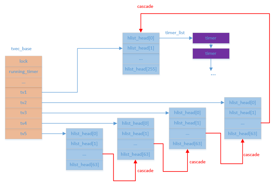 所有这种一级时间轮的实现方式所带来的空间复杂度还是不小的。特别是在需要跨度比较长的定时器时。基于此,就出现了多级时间轮,也就是linux2.6.16之前内核所采用的定时器的实现方式。