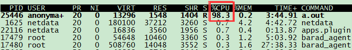 下面是一段死循环的代码,可以看到CPU跑满了(单核机器):