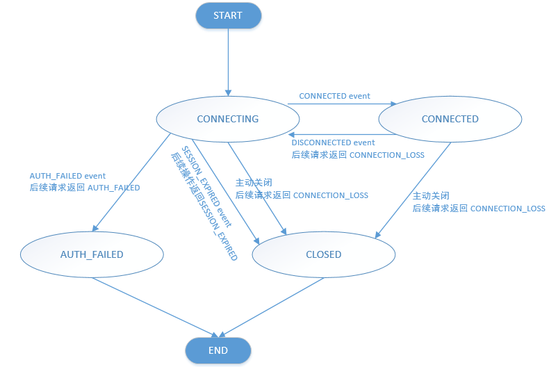 ZK Client通过ZooKeeper提供的client binding 代码(官方提供:C/Java两种Client API)创建一个handle来和ZooKeeper服务建立Session连接。创建一个handle进行连接后,client会处于CONNECTING状态,然后client library会进行尝试对ZK服务集群中的server发起连接,成功后client会置为CONNECTED状态。当发生不可恢复的错误,例如会话过期,鉴权失败,或者client主动进行关闭,handle会切换为CLOSED状态。以下是ZK client session的状态转换图: