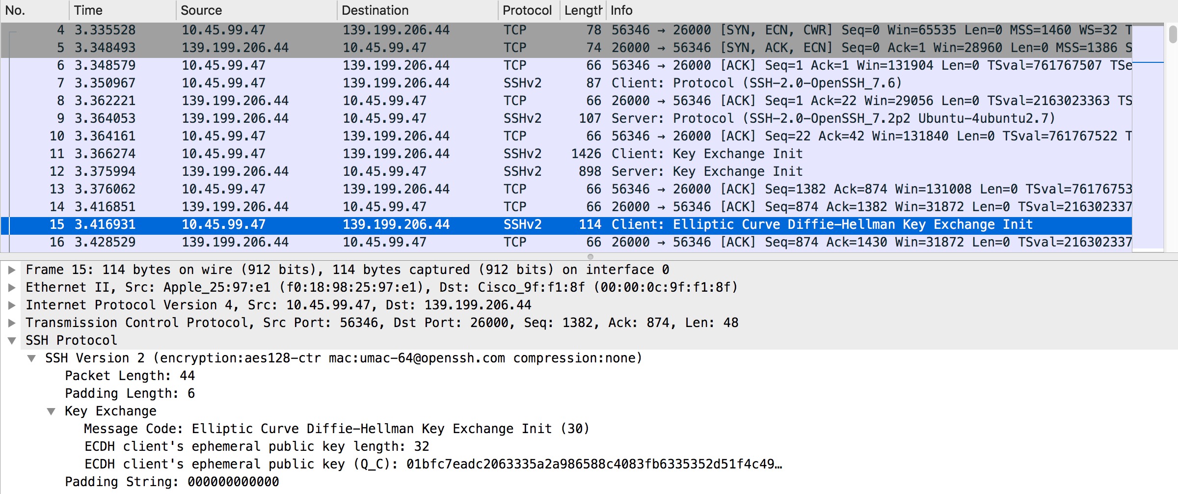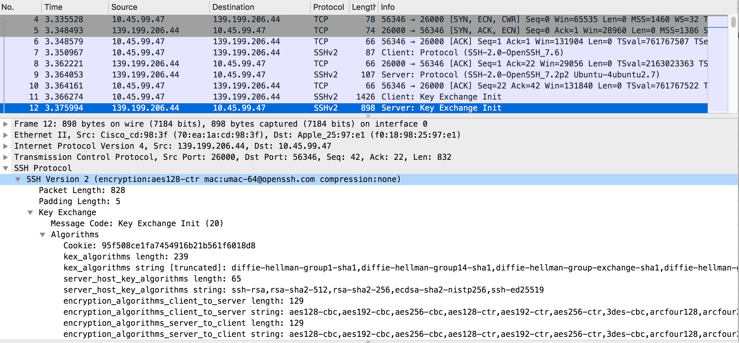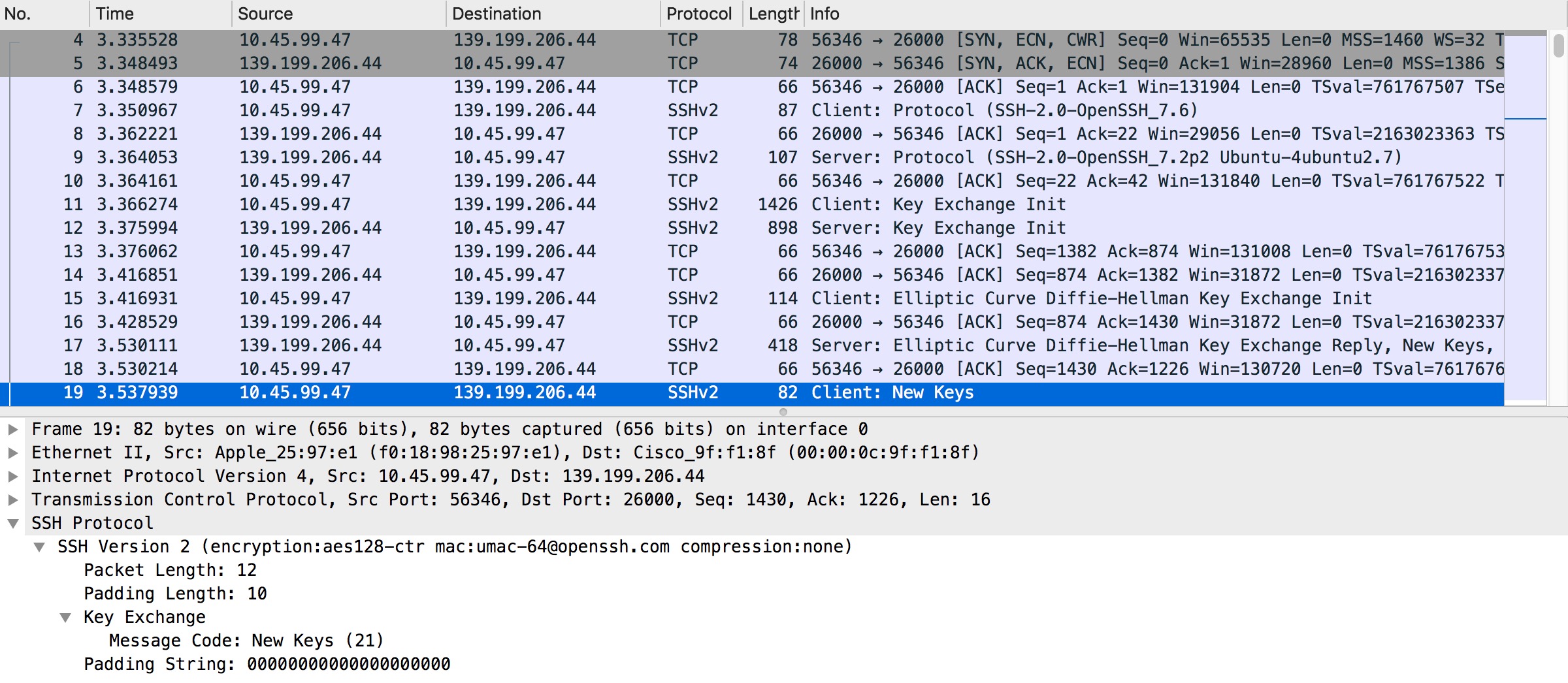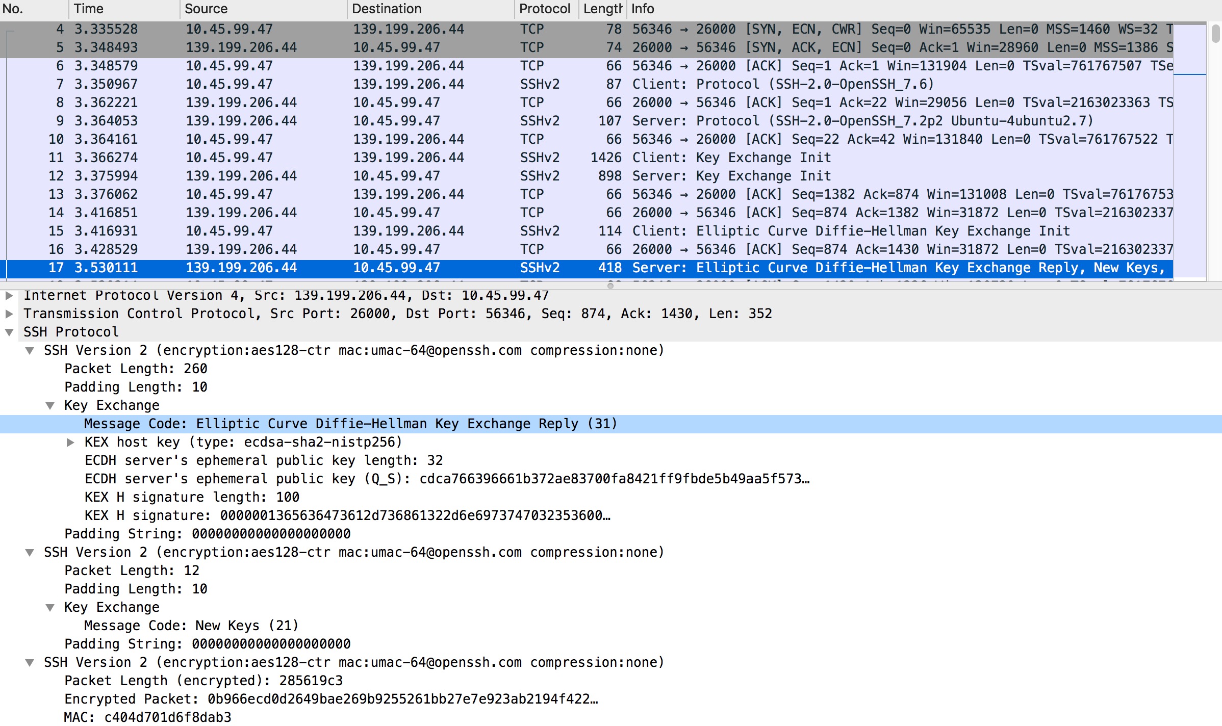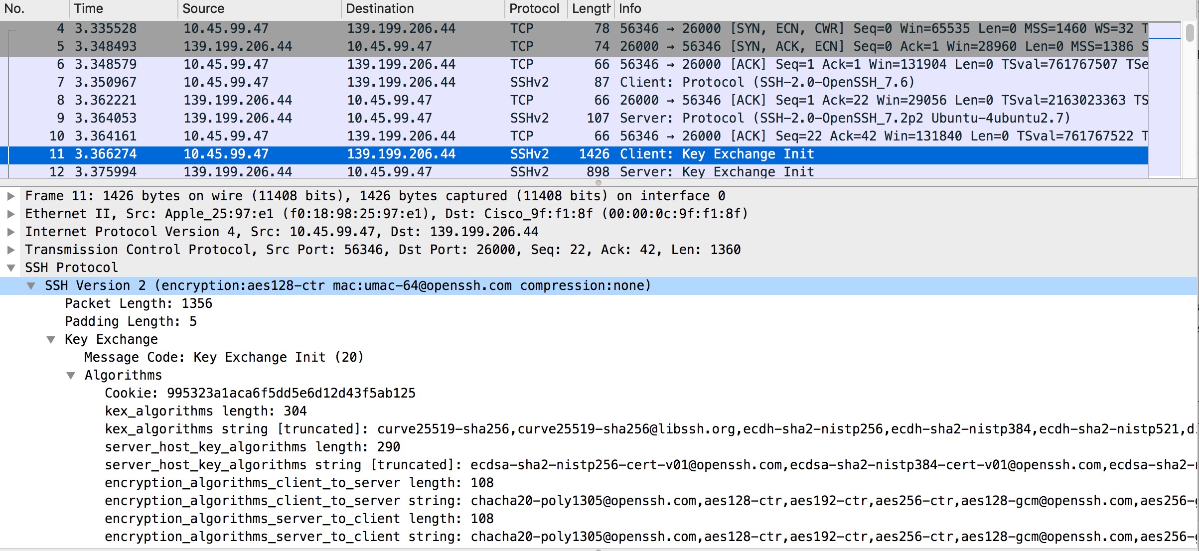 数据包的完整性是通过二进制包末尾的MAC消息认证码进行保证的,MAC值是通过共享密钥,包序号,包数据通过HASH算法计算得出。MAC算法和密钥是在密钥交换算法协商过程中得出的,所以,初始的包MAC数据是无效的,length必须为0。