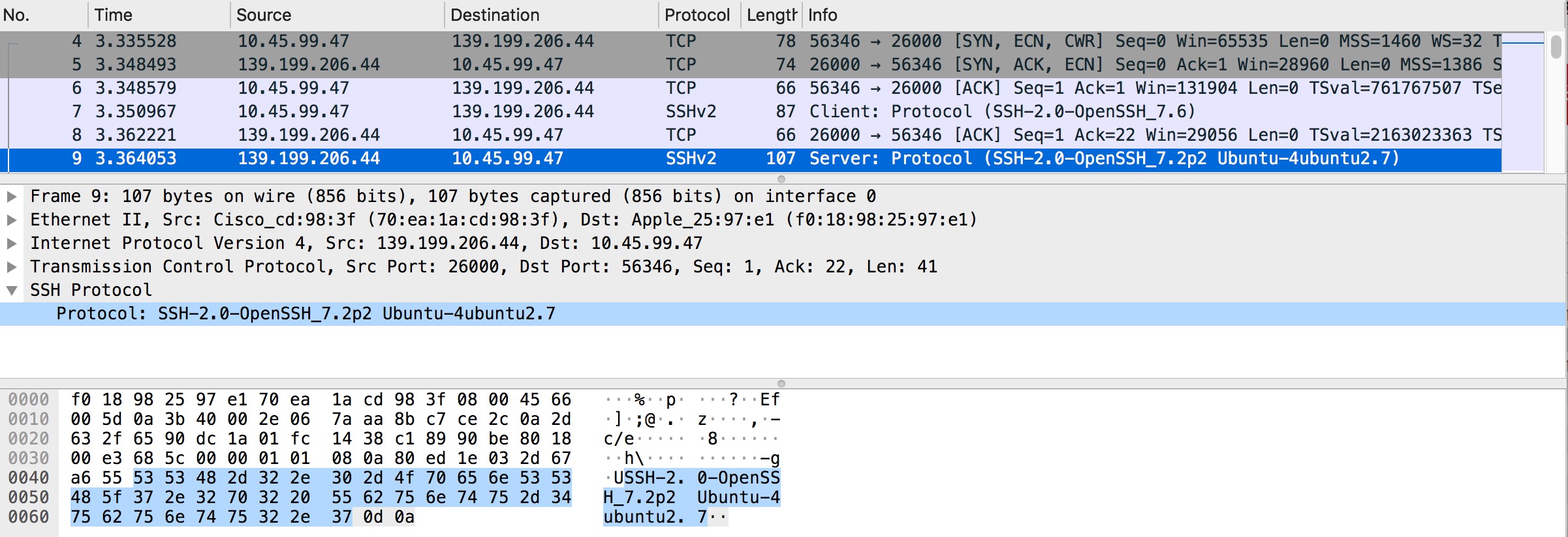 在通过WireShark抓取SSH包的时候,一开始总是无法分析SSH协议,都是以TCP协议来展示,经过几番探索发现,原来WireShark的工作原理是对固定的熟知端口的协议进行分析,如果你的服务提供方换了端口,WireShark是不会进行对于的协议分析的,而我连接的server SSH的端口是配置成了26000的,需要在菜单:”Edit(编辑)->Preference(首选项)->Protocols->SSH”中的TCP ports中添加26000端口,表示关于此端口的通信,也采用SSH协议分析。