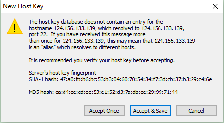 传输层建立链接协商完秘钥后,客户端收到服务器的Host key和其摘要,第一次连接服务器,会显示host key fingerprint,需要人为判断该host key fingerprint是否是真实的服务器。确认后会将该服务器加入 ~/.ssh/know_hosts中。如下图所示: