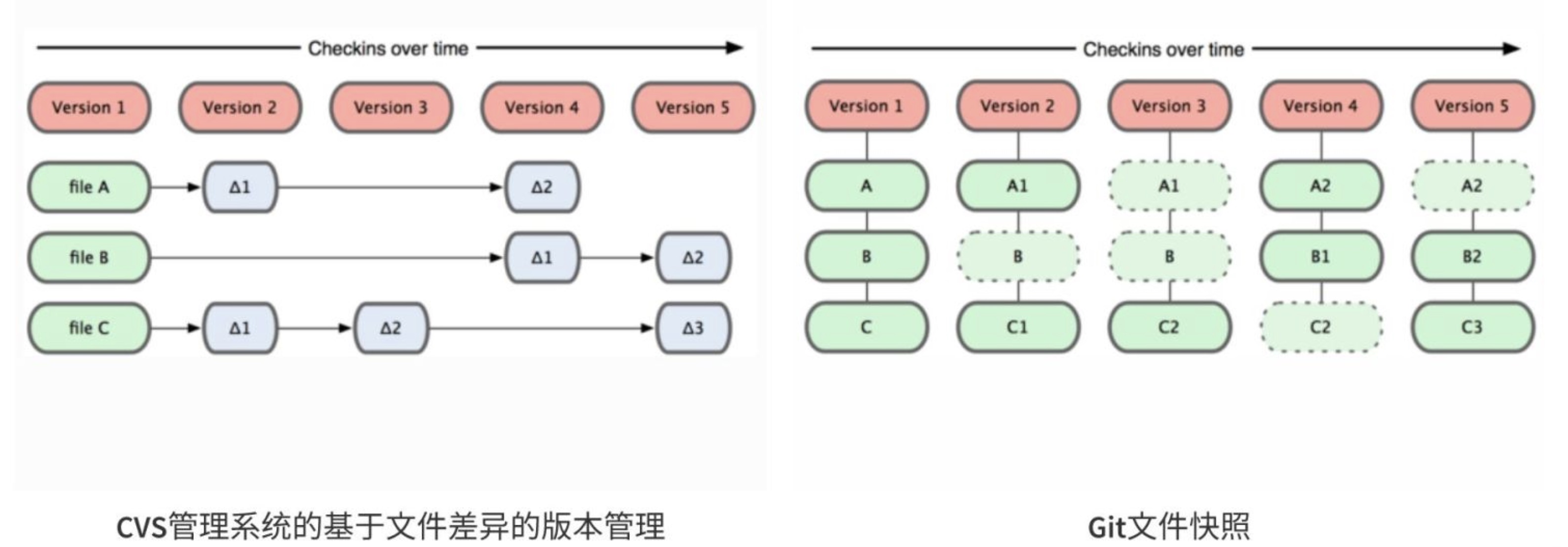 对于我们今天说的Git,除了拥有分布式的版本控制系统的特性,还有一个重要的实现差别就是:Git对待文件的变更是通过保存整个文件的快照来实现,而不是像其他系统将文件变更的差异进行保存来实现。