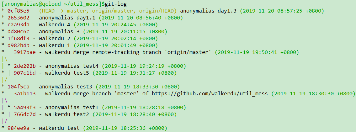 alias git-log='git log --graph --pretty=format:'\''%Cred%h%Creset -%C(yellow)%d%Creset %cn %s %Cgreen(%ad)%Creset'\'' --abbrev-commit --date='\''iso'\'''