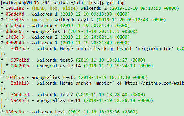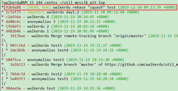 我们把bob分支回滚到最开始的状态即alice的分支状态,继续测试rebase的fixup功能,fixup和squash功能基本一样,差别在于直接丢弃此次提交的日志,使用上一次提交的日志,所以没有交互过程。所以fixup相对使用频率比squash要高: