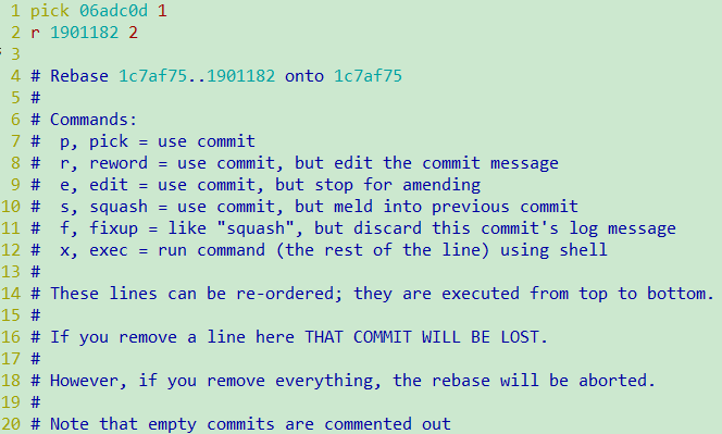 reword功能就是合并这次提交, 但是需要修改此次提交的日志信息。如下将1901182的commit进行reword操作,**将pick改成reword关键字(或r缩写)**。