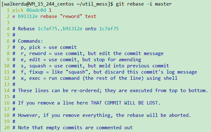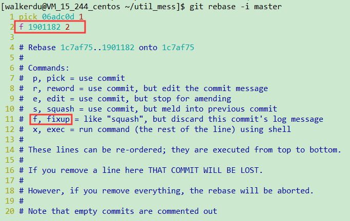 - f, fixup = 和squash基本一样,差别在于直接丢弃此次提交的日志,使用上一次提交的日志,所以没有交互过程。