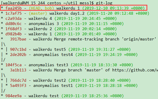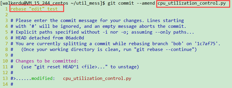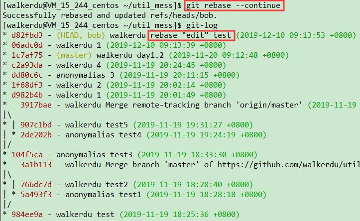 在上面reword修改的基础上,继续在bob分支上进行edit功能的测试,如下: