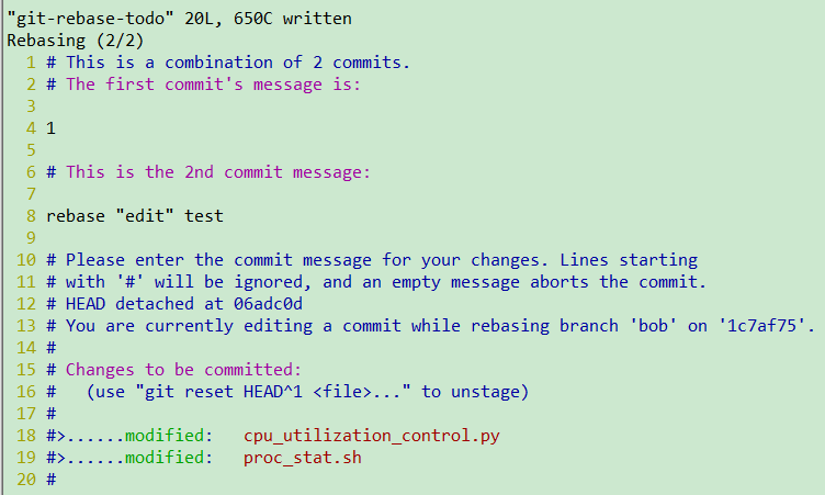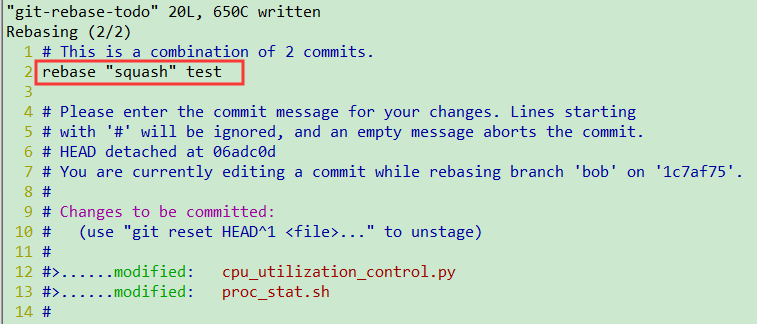 在上面edit修改的基础上,继续在bob分支上进行squash功能的测试,前面已经解释了squash的功能:把这次提交和上一次提交融合在一起提交,会让提交者重新编辑提交日志。如下:将d82fbd3的提交和前一次06adc0d的提交合并成一次提交: