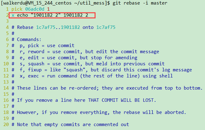 如下:rebase过程放弃了1901182的提交,而是执行了上面的echo命令,不知道这个功能在什么情况下会使用到。