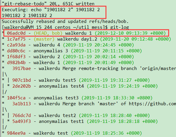 我们把bob分支回滚到最开始的状态,继续测试rebase的exec选项,exec的功能是:不合并这次提交,而是执行后面的shell命令。