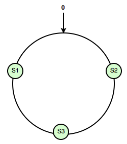 如下图:三个服务节点S1,S2,S3通过HASH映射到圆上的三个点: