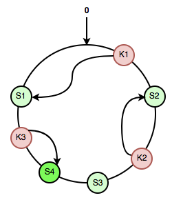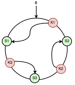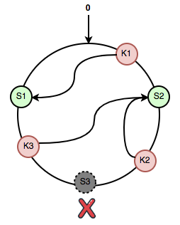 上述两步一般的HASH算法都可以做到,那一致性hash的是为了解决什么呢?就是为了解决在HASH表大小发生变化时,只有$K/n$个key需要进行重新映射,即保证在某个节点发生故障时,只会影响当前节点的映射关系,而不会影响到其他的节点的映射!如下图,当S3服务节点出现故障时,请求K3会被转发到S2上: