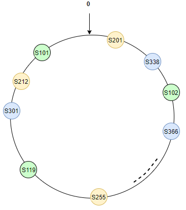 一致性HASH为了解决在服务节点少的情况下且遇到故障时不能平衡性的问题,作者Karger在论文中提出了:一致性HASH需要将C个服务节点拷贝k份,也就是大家说的构建虚拟节点。将每个节点拷贝100份,生成的HASH圆环简要信息如下:此时如果S3挂了,基本上可以保证S1和S2各承担50%的流量,保证了平衡性。