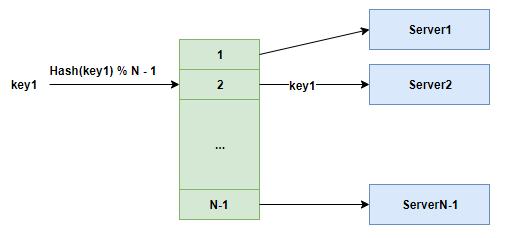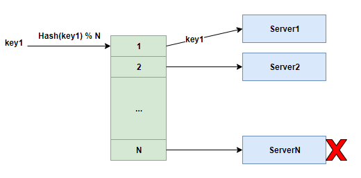 由上述HASH index的计算过程可以知道,在某个节点故障或者添加节点的时候,由于array_size发生变化,可能会导致所有key最终生成的index全部都发生变化,导致节点的映射发生变化。这对于一些分布式的服务中缓存的cache会失效,因为之前的请求可能会被转发到其他server,这会使系统的性能带来急剧的下降,这是我们不希望看到的。如下图所示ServerN的故障就会导致之前的key的映射关系发生变化: