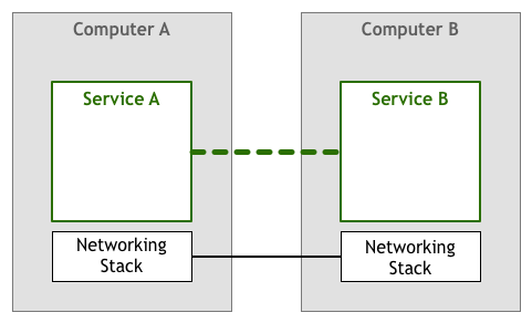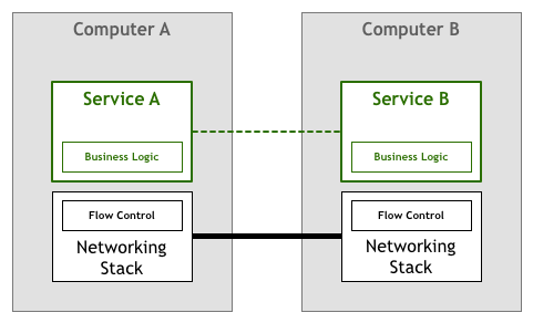 跨机的ServiceA和ServiceB之间进行通信,以达到用户的某些目的。这是一个简化的视图,这里省略了在代码操作的数据和通过线路发送接收的电信号之间转换的很多层。不过这个抽象对于我们讨论问题已经足够了。接下来我们显示网络堆栈部分作为一个不同组件来增加更多的细节信息: