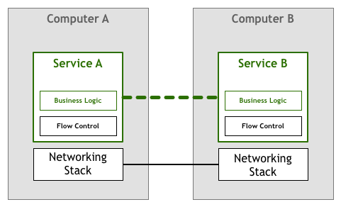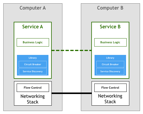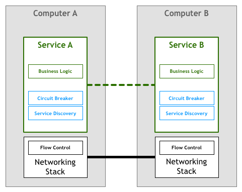 有一段时期,编写网络服务和应用程序的开发者来负责处理上述流量控制的问题。这就意味着在编写应用程序过程中必须包含上述逻辑以确保我们不会使服务过载。这种重网络处理的逻辑和我们的业务逻辑同时存在代码里。在我们的抽象图中,应该是这样的: