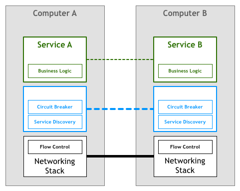 事实上,上述两个服务发现和熔断器的两个服务,很难去正确的实现,以至于 Twitter’s Finagle and Facebook’s Proxygen的两个庞大和复杂的库变得十分的流行,避免在每个服务中再造轮子。