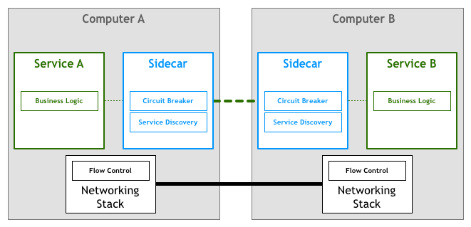 不幸的是,更改协议栈来增加微服务的功能不是一个可行的方案,许多开发者是通过一组代理来实现此功能。这里的设计思想是服务不需要和下游服务直连,所有的流量都通过该代理透明的来实现对应的功能。