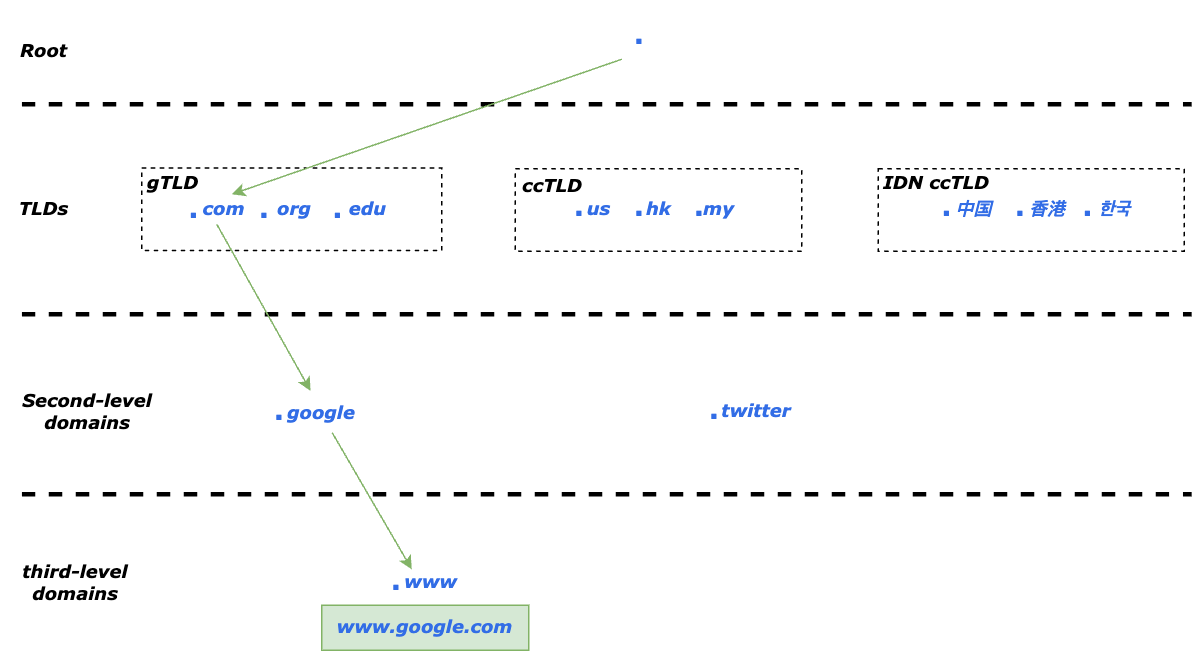 - 节点的域名是从节点到树根路径上的标签列表。按照惯例,组成域名的标签从左到右打印或读取,从最具体(最低,离根最远)到最不具体(最高,离根最近)。