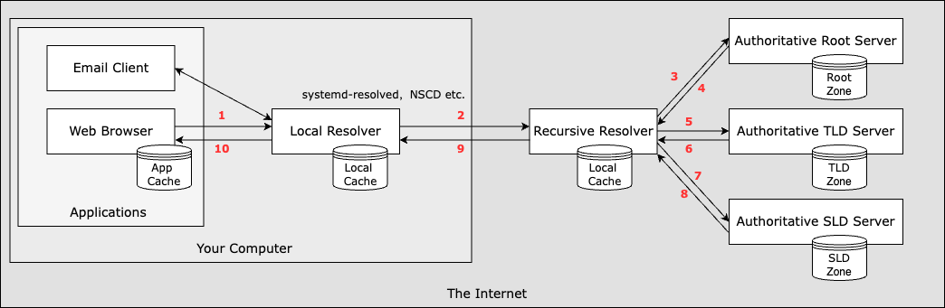 这种机制如果每个互联网解析都需要从根服务器开始,将给根服务器带来巨大的流量负担。实际上,在DNS服务器中使用缓存以减轻根服务器的压力,因此,根名称服务器实际上只参与了相对较小比例的请求。其中本地域名服务器起到一个很关键的作用,下面是一个加了本地域名服务器的域名解析图示「引用wikipedia」,如下: