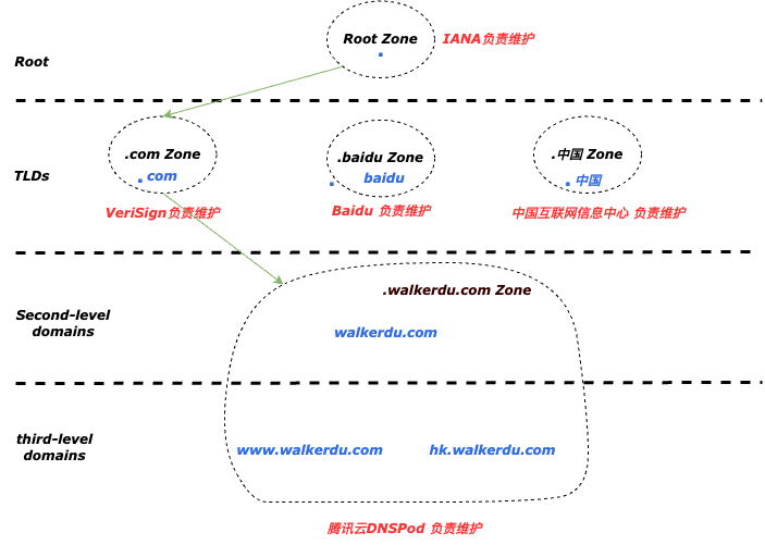 关于BIND中DNS 域名结构的定义,我画了一个简要的结构描述示意图,如下: