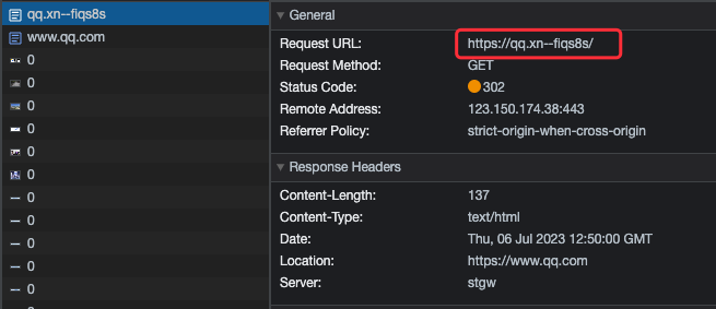 当我们在浏览器输入qq.中国的时候,浏览器自动做了编码转换,如下: