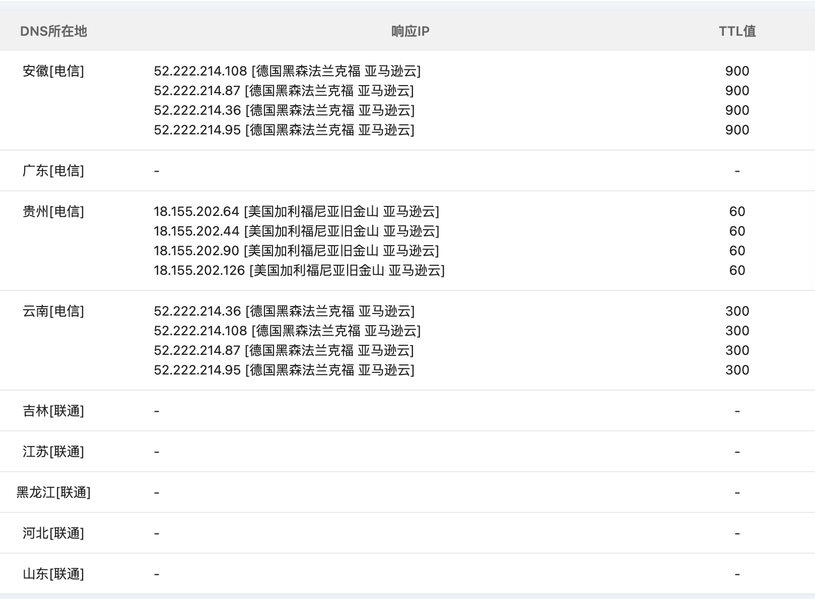 这个域名是通过aws来托管的。下面我们通过EDNS Client Subnet选项来传递客户端的subnet,如下使用河北电信的一个subnet测试,可以看到结果和本地直接dig获得的是不同的解析结果: