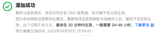 下面是在DNSPod上面添加域名对应的A记录的提示,虽然实际上并没有延迟那么久,但是还是那个问题:按道理RR记录都是有TTL的过期时间,为什么不按规范,还存着呢?虽然RR记录变更的不难么频繁,Cache久一点确实可以加速访问,但是准确性不需要考虑的吗?