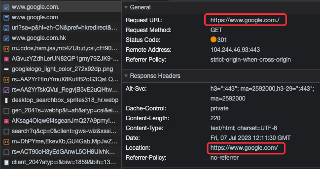 在介绍「域名层级和结构」一节中,我们知道了DNS的Domain Name规范最后要求有一个空串表示的root label,以此表示绝对域名,在书写的时候就会表现为域名最后有一个.。如下,在Chrome中输入www.google.com.后的请求表现:可以看到www.google.com.被重定向到了www.google.com