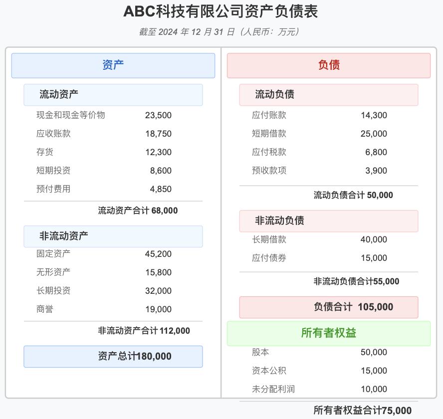 - 资产(Assets):公司拥有的所有经济资源,包括现金、应收账款、存货、固定资产等。