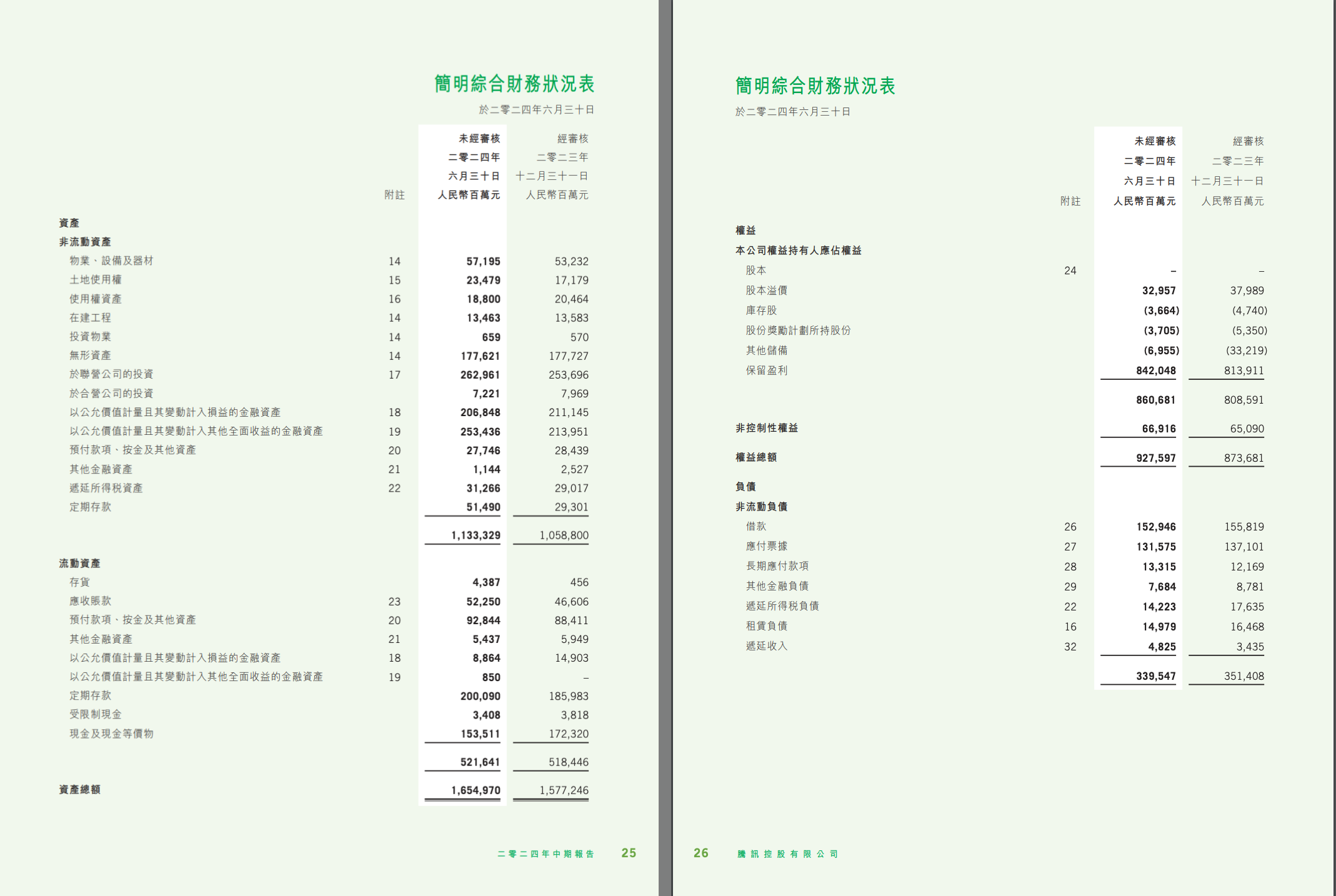 下面是腾讯2024 2季度的财报中关于资产负债表(财报中的财务状况表)的部分截图: