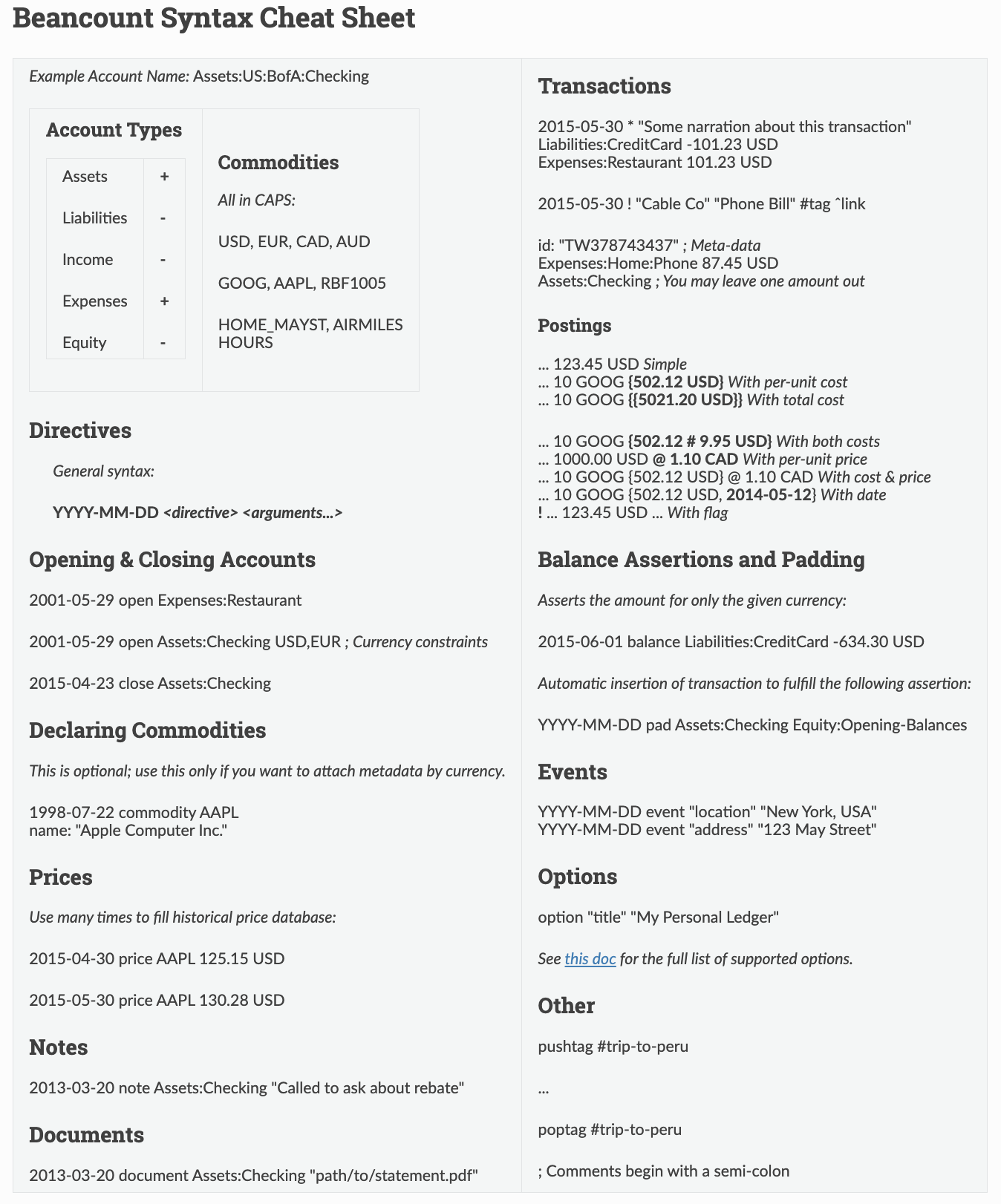 我们先看一下Beancount的语法速查表,然后后面仔细看一下语法的详细介绍,