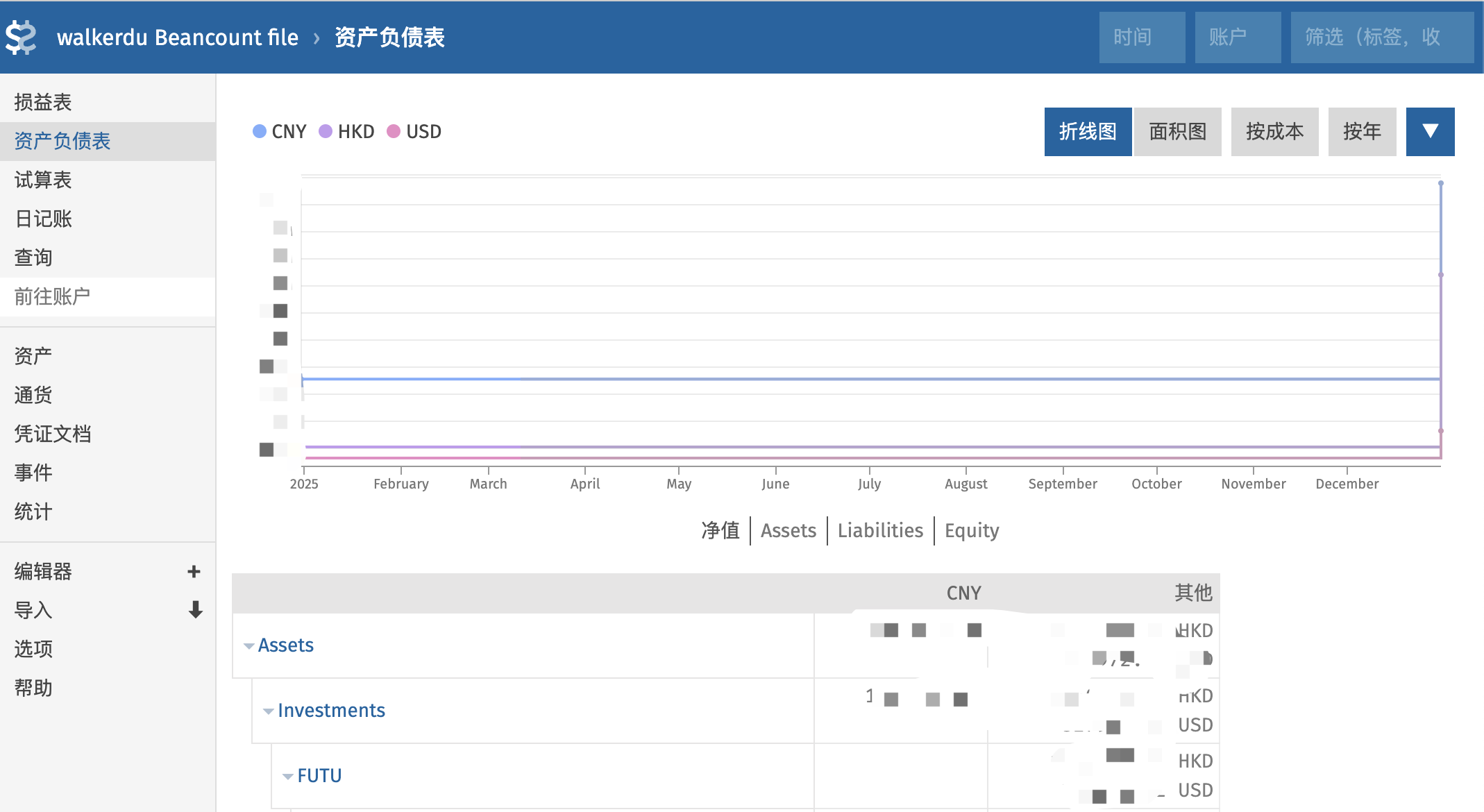 其实beancount本身也提供了bean-web的可视化管理工具,是fava的简洁版本,如下,也提供了资产负债表和损益表: