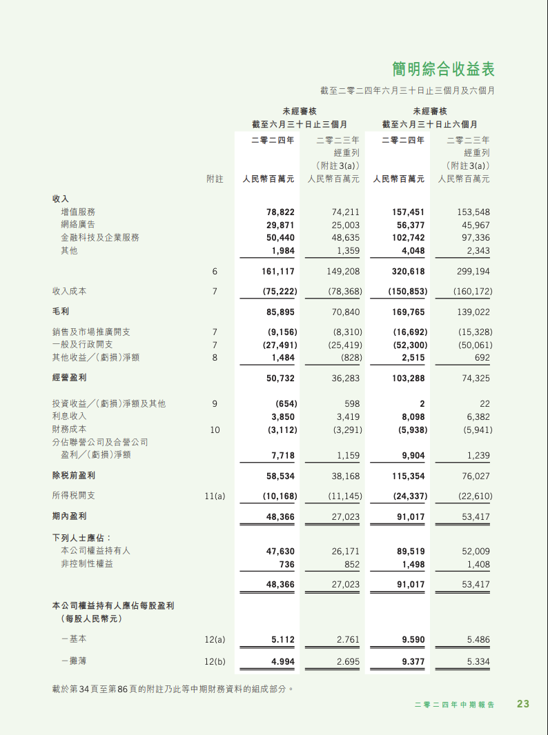 下面是腾讯2024 2季度的财报中关于损益表(财报中的收益表表)的部分截图: