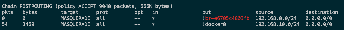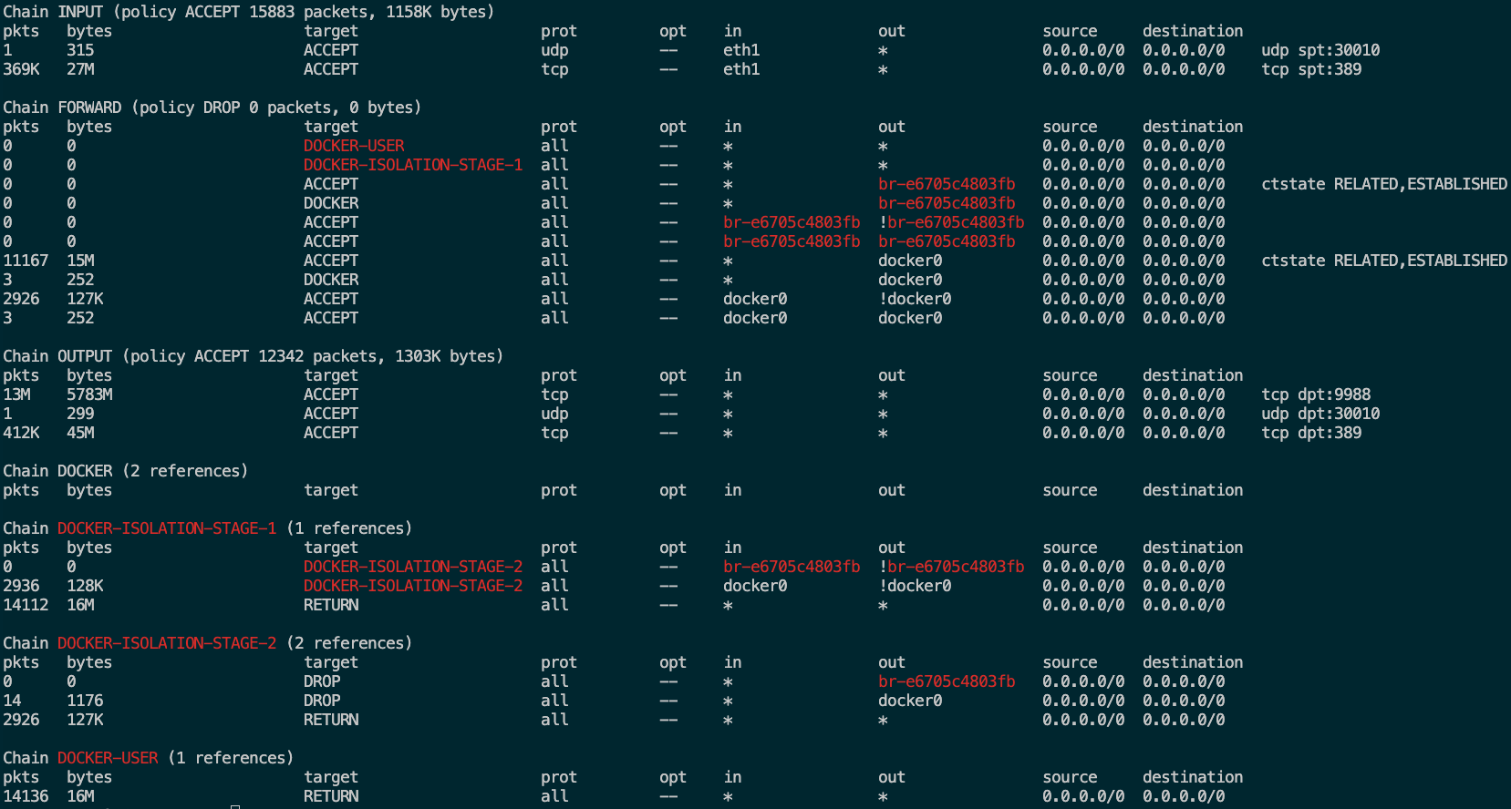 1 2 3 4 5 $ iptables -L FORWARD -n -v|grep br-2f8183e15eda 0 0 ACCEPT all -- * br-2f8183e15eda 0.0.0.0/0 0.0.0.0/0 ctstate RELATED,ESTABLISHED 0 0 DOCKER all -- * br-2f8183e15eda 0.0.0.0/0 0.0.0.0/0 0 0 ACCEPT all -- br-2f8183e15eda !br-2f8183e15eda 0.0.0.0/0 0.0.0.0/0 0 0 DROP all -- br-2f8183e15eda br-2f8183e15eda 0.0.0.0/0 0.0.0.0/0