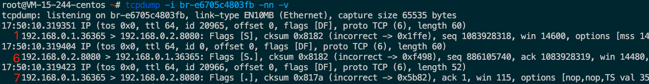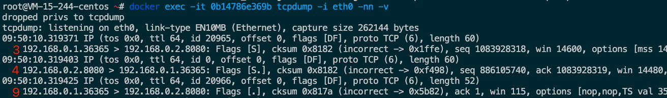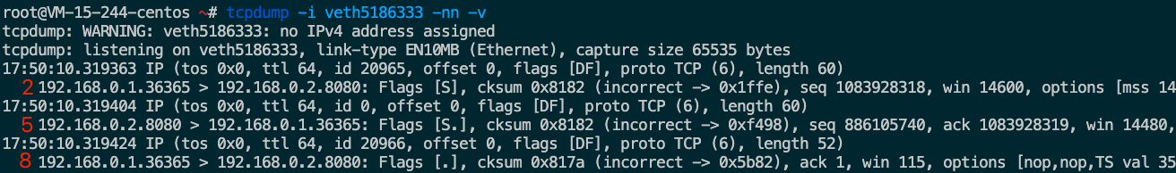 1 2 3 4 5 6 $ ip netns exec 519973c21f1e tcpdump -i eth0 -nn -v tcpdump: listening on eth0, link-type EN10MB (Ethernet), capture size 262144 bytes 16:34:03.398660 IP (tos 0x0, ttl 64, id 32603, offset 0, flags [DF], proto ICMP (1), length 84) 192.166.2.6 > 192.166.2.4: ICMP echo request, id 8, seq 1, length 64 16:34:03.398688 IP (tos 0x0, ttl 64, id 53624, offset 0, flags [none], proto ICMP (1), length 84) 192.166.2.4 > 192.166.2.6: ICMP echo reply, id 8, seq 1, length 64