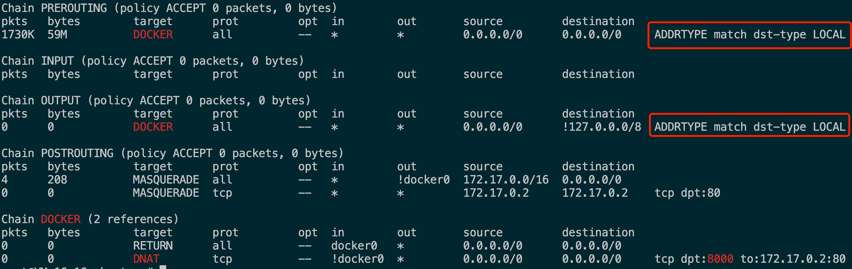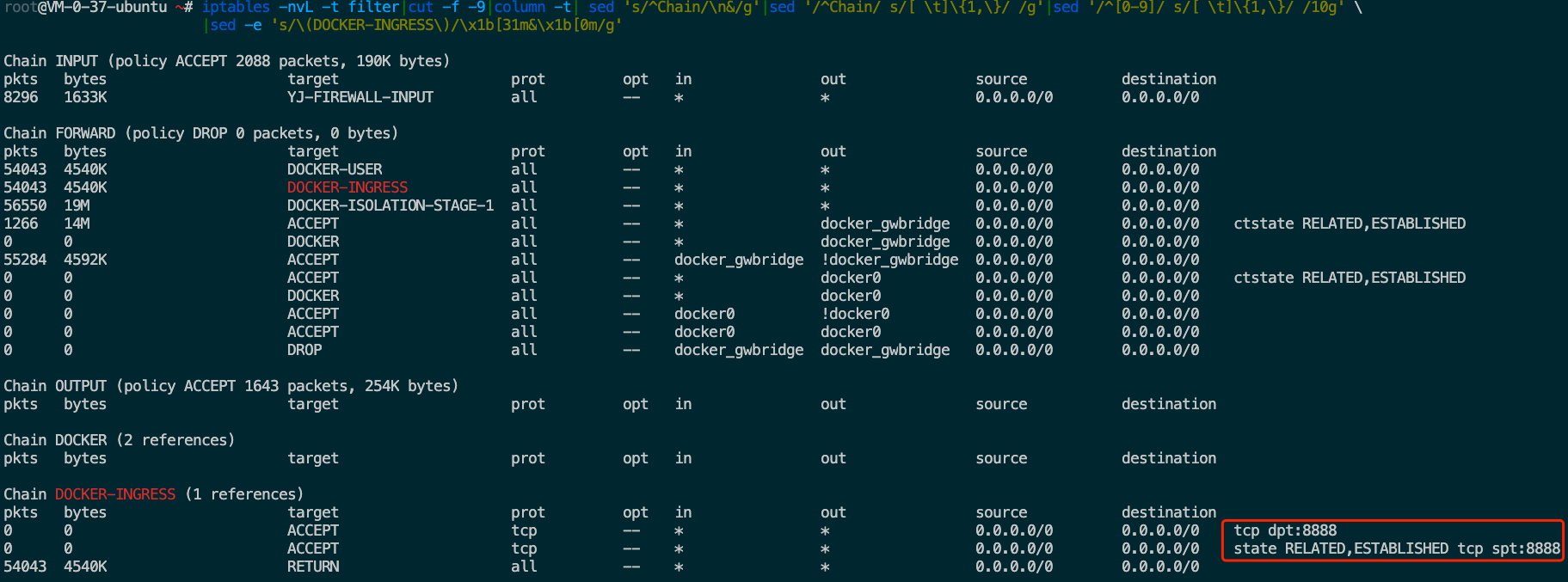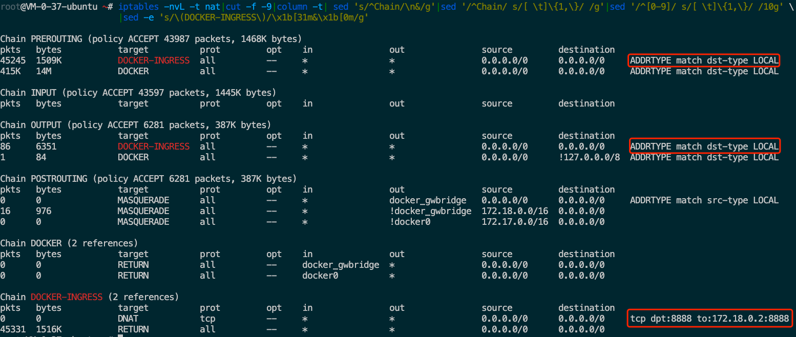 我们看到PREROUTING 链和OUTPUT链都有自定义链DOCKER-INGRESS,用来过滤进入本机(入站路由前 )的数据和出站(出站路由前 )数据,匹配目标地址类型为 LOCAL 的所有协议数据包,且本地目标端口为8888的数据包,全部转发到172.18.0.2:8888。