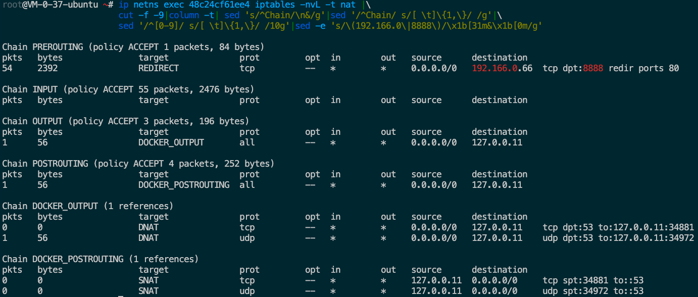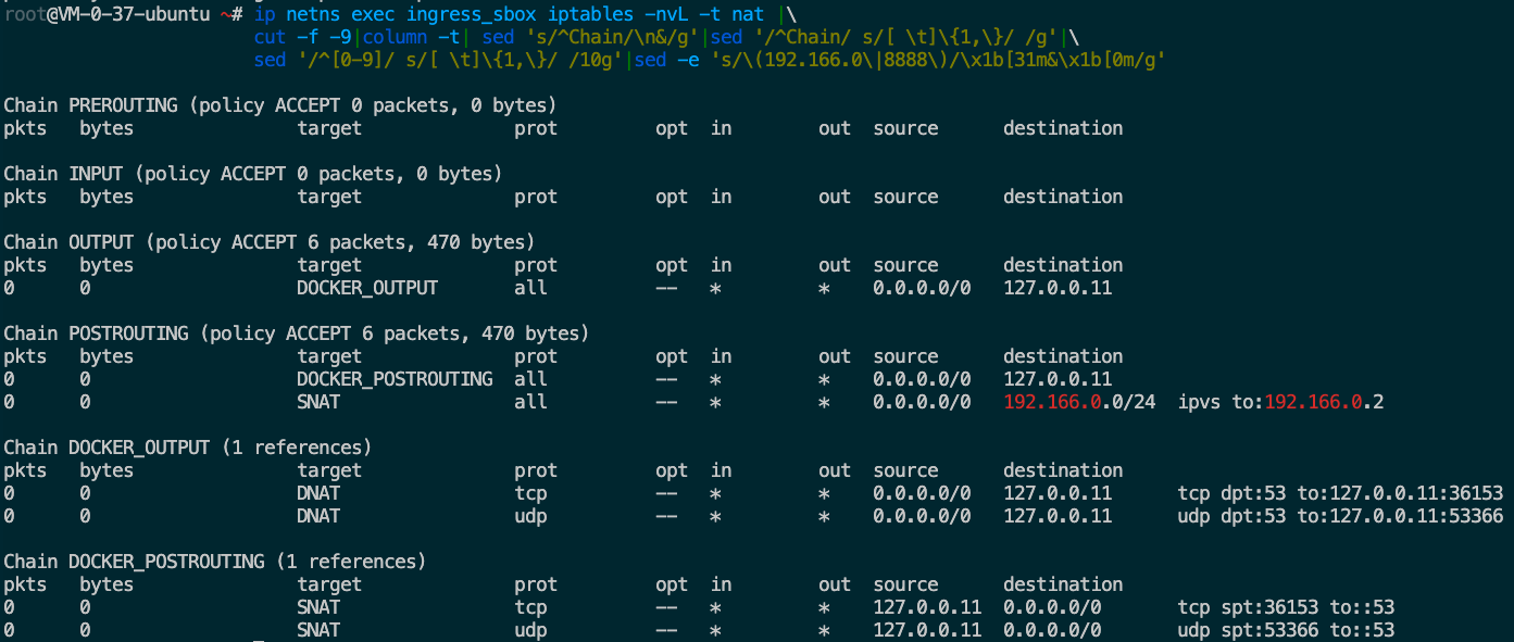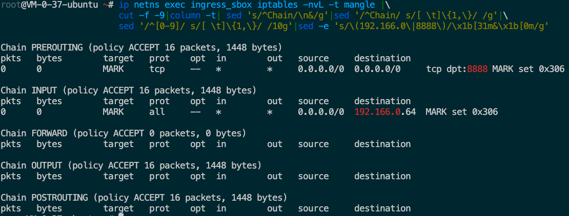 1 $ ip netns exec ingress_sbox iptables -nvL -t mangle | cut -f -9|column -t| sed 's/^Chain/\n&/g' |sed '/^Chain/ s/[ \t]\{1,\}/ /g' |sed '/^[0-9]/ s/[ \t]\{1,\}/ /10g' |sed -e 's/\(192.166.0\|8888\)/\x1b[31m&\x1b[0m/g'