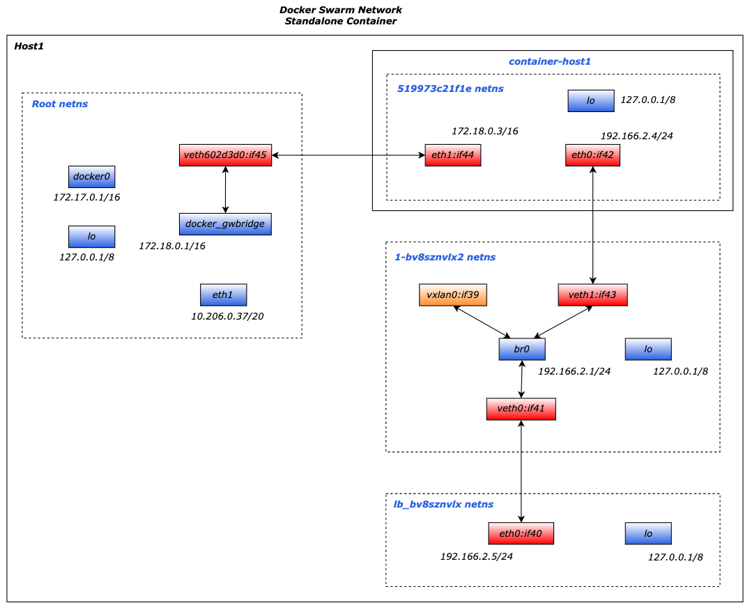 我们可以看到基于overlay-test-1的overlay网络创建的standalone Container和普通基于bridge网络运行的Container有比较明显的区别:Container内有两张veth网卡:eth1和eth0 ,它们的功能分别是: