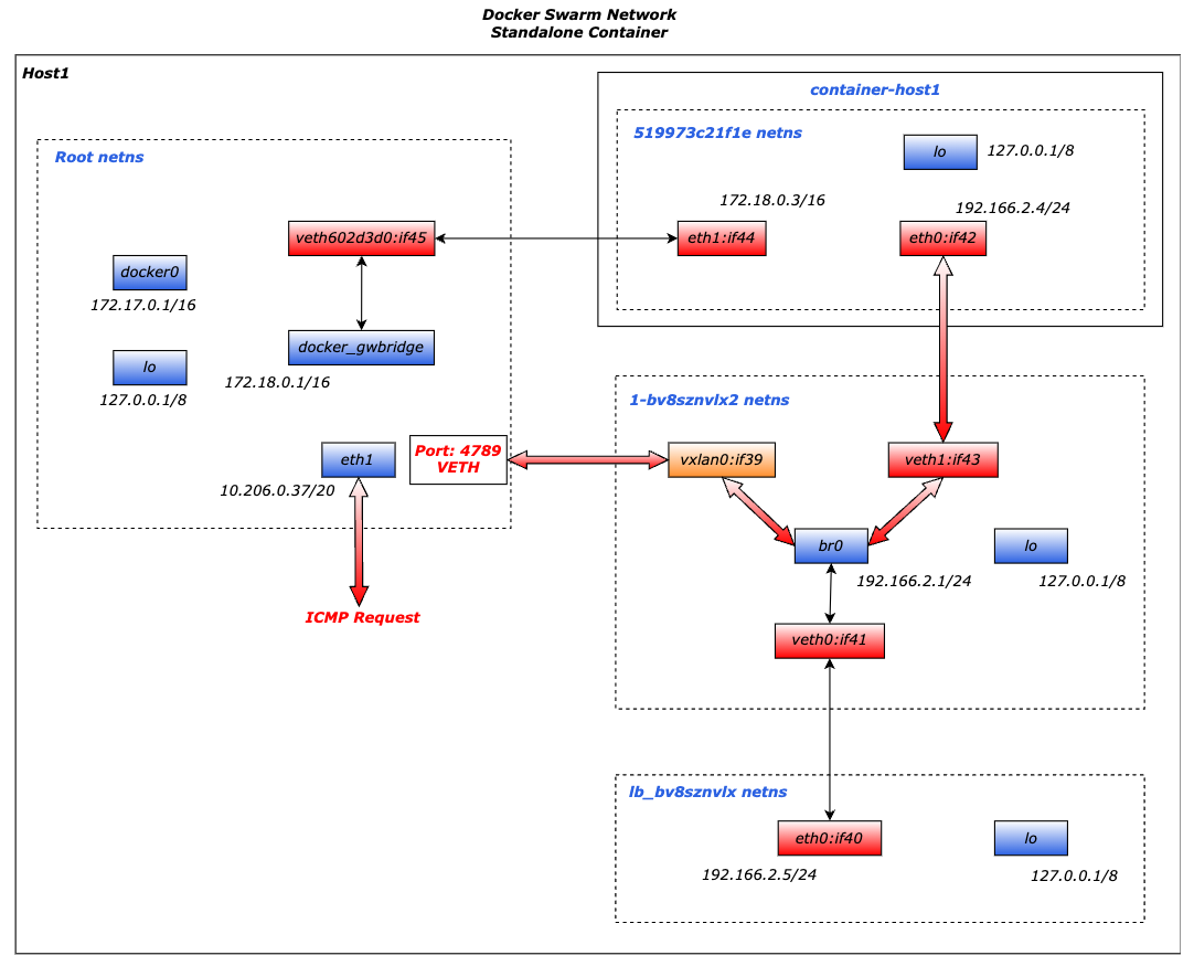 1 2 3 4 5 6 7 8 $ docker exec -it container-host2 ping container-host1 PING container-host1 (192.166.2.4) 56(84) bytes of data. 64 bytes from container-host1.overlay-test-1 (192.166.2.4): icmp_seq=1 ttl=64 time=0.437 ms 64 bytes from container-host1.overlay-test-1 (192.166.2.4): icmp_seq=2 ttl=64 time=0.365 ms ^C --- container-host1 ping statistics --- 2 packets transmitted, 2 received, 0% packet loss, time 1004ms rtt min/avg/max/mdev = 0.365/0.401/0.437/0.036 ms
