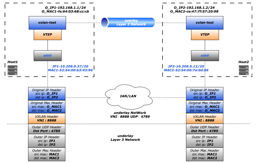 VXLAN 使用了一种封装机制,结合了ARP 和 FDB(Forwarding Database)表的功能来实现跨主机的通信 。ARP 只解析内部 IP 到内部 MAC 地址,VXLAN 依赖 FDB 的额外信息来实现从内部 MAC 到远端主机(VTEP IP)的映射。