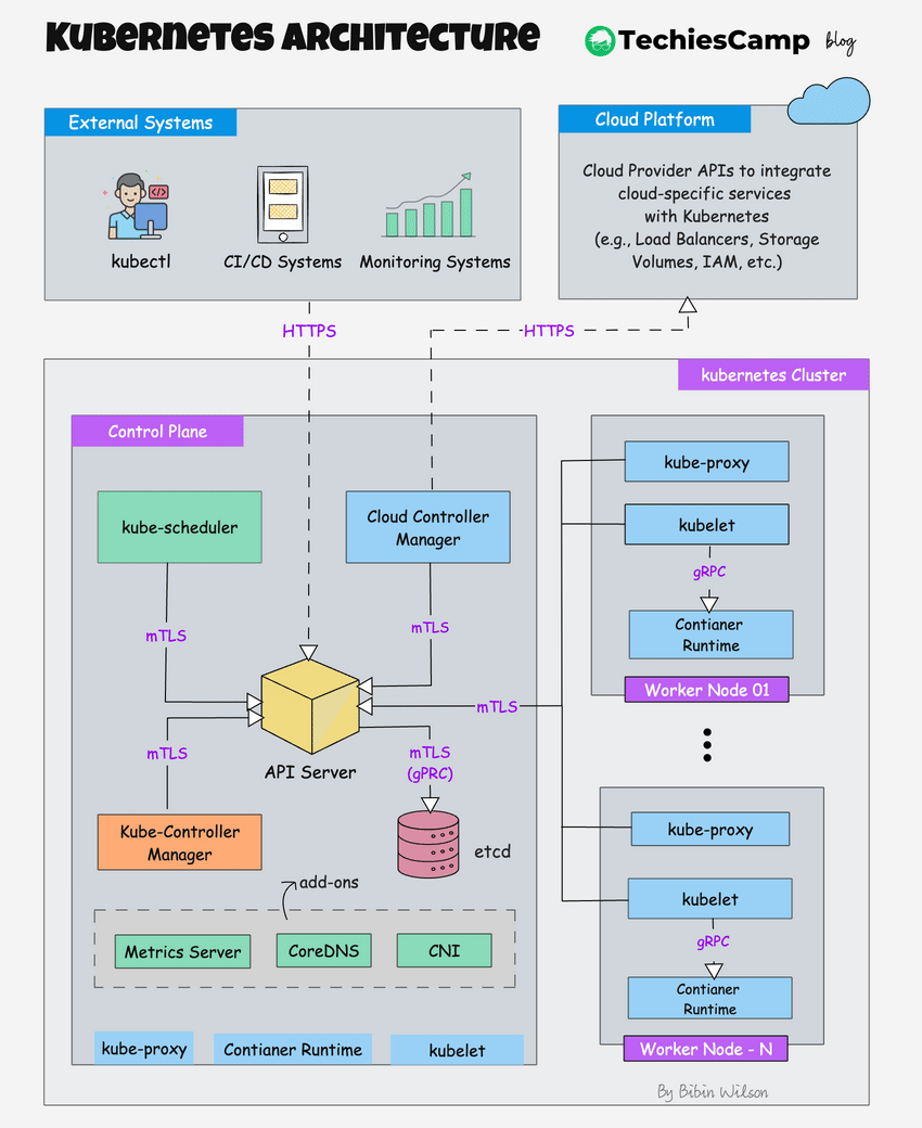 下面的Kubernets集群架构图概括性的阐述了构建集群必不可少的Control Plane组件,相对上图,更简洁。